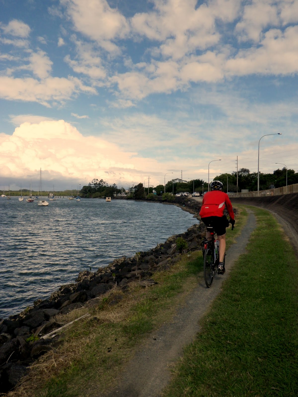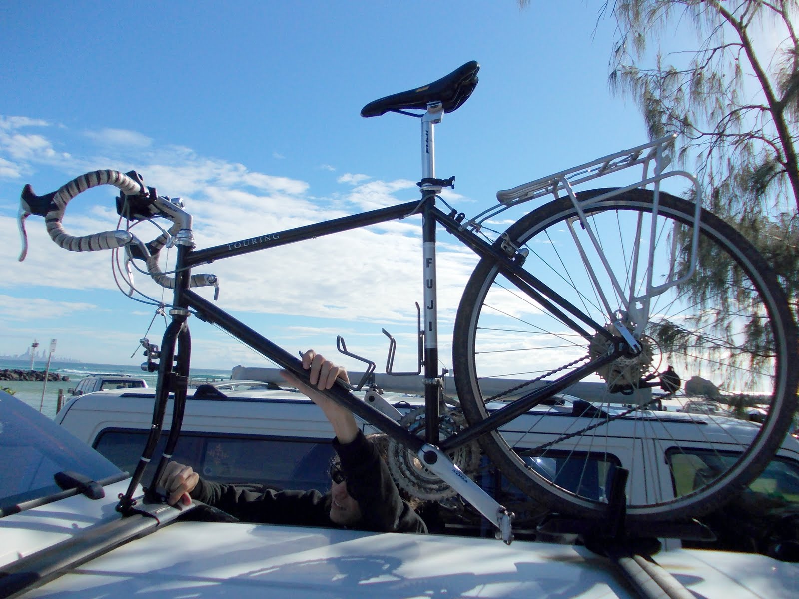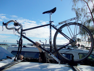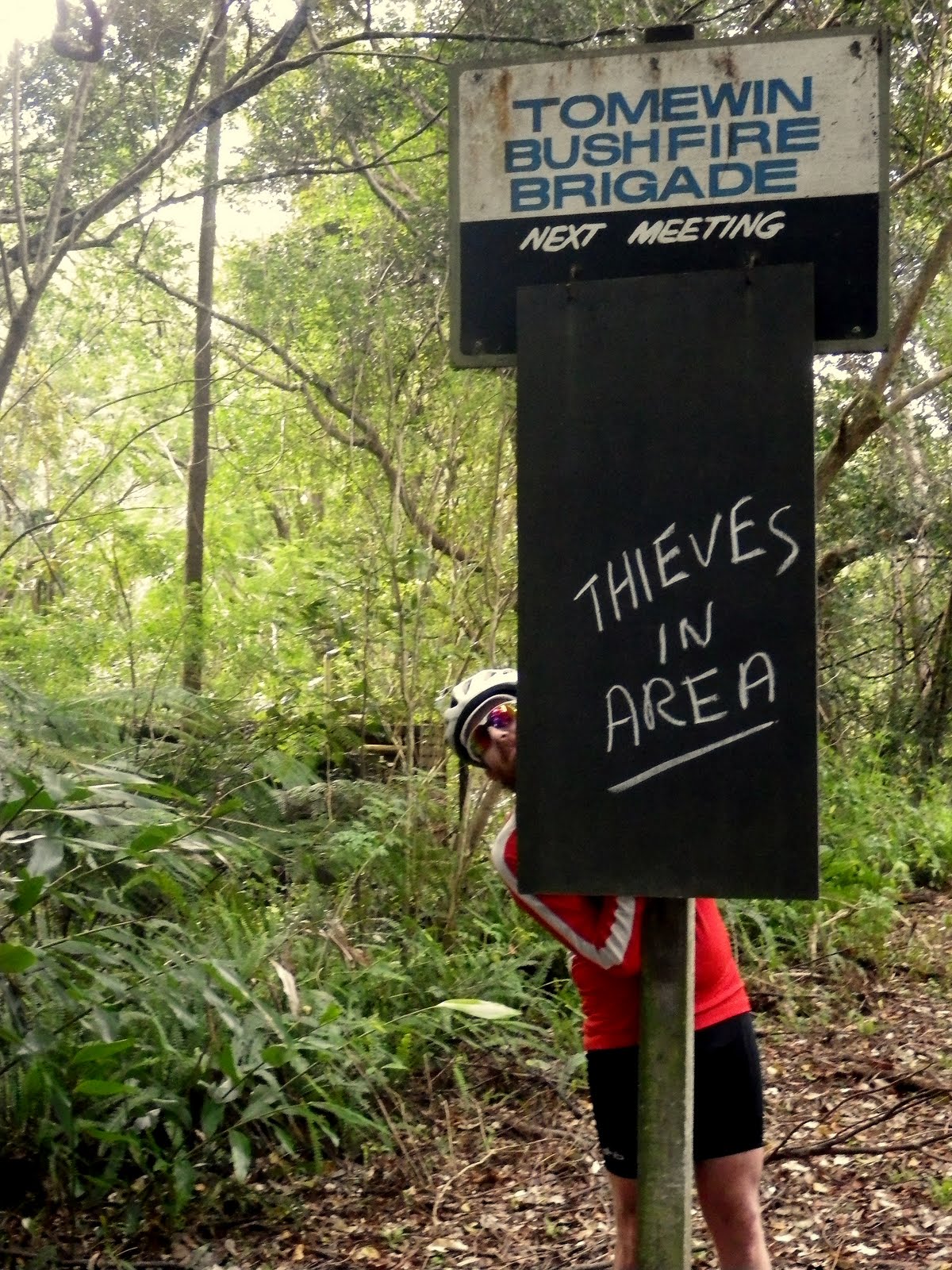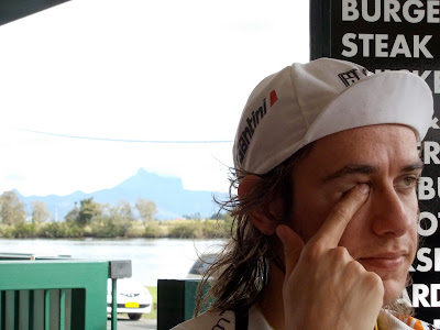 Two cyclists in a local surfie hangout looked fairly out of place, and we were a little concerned for our safety (for our international readers, surf beaches on the East Coast are often the hangout for aggressive, intolerant, bigot, racist bogans sporting Australia tattoos, Australia towels, Australia hats, Australia sunnies and Australia shorts who like to punch on with anyone not "local"). Not wanting to be the epicentre of some kind of Currumbin Cyclist Riot, we were pretty keen to get moving as soon as possible from the bad vibe carpark.