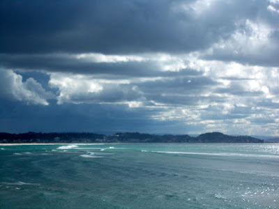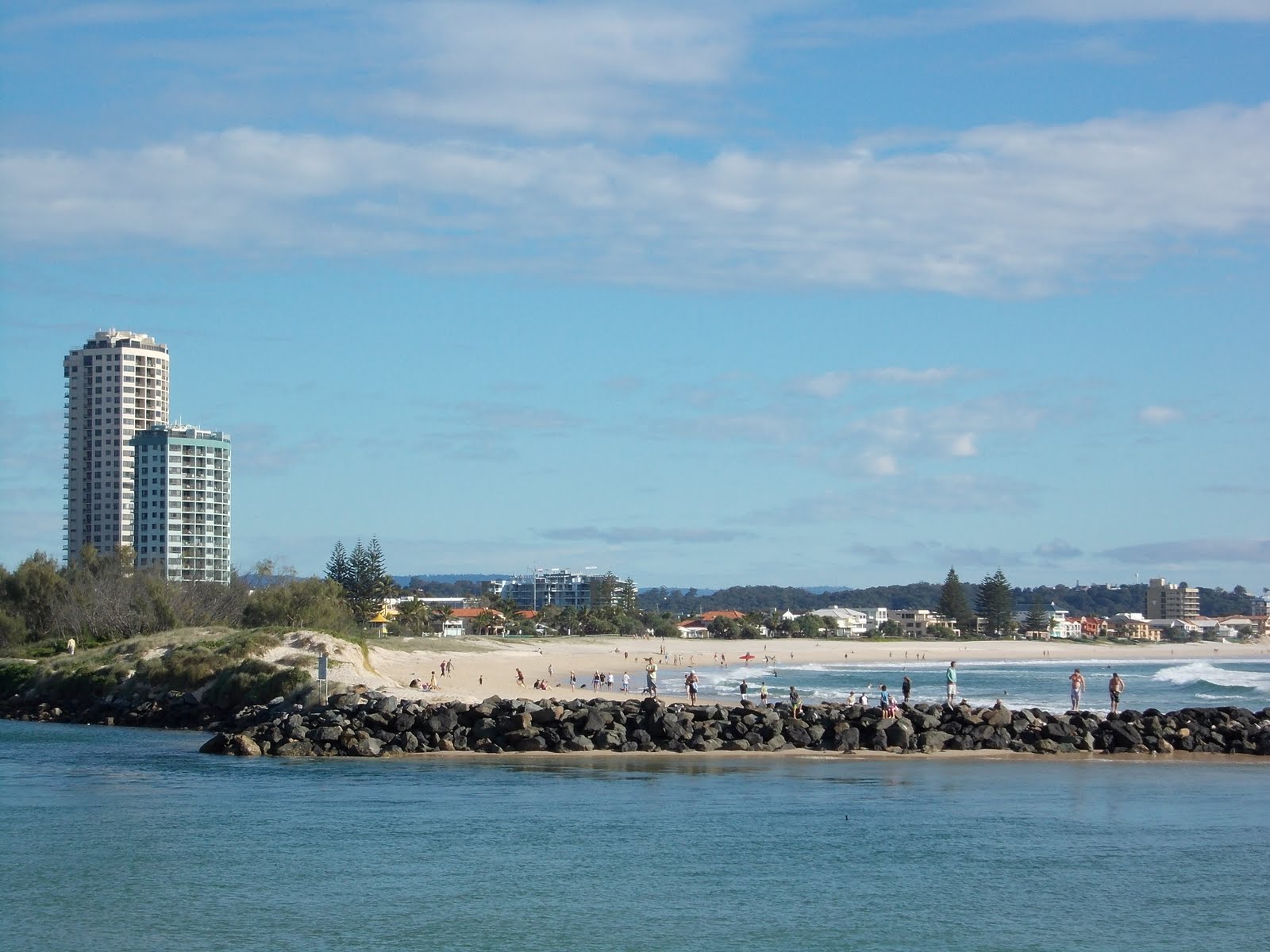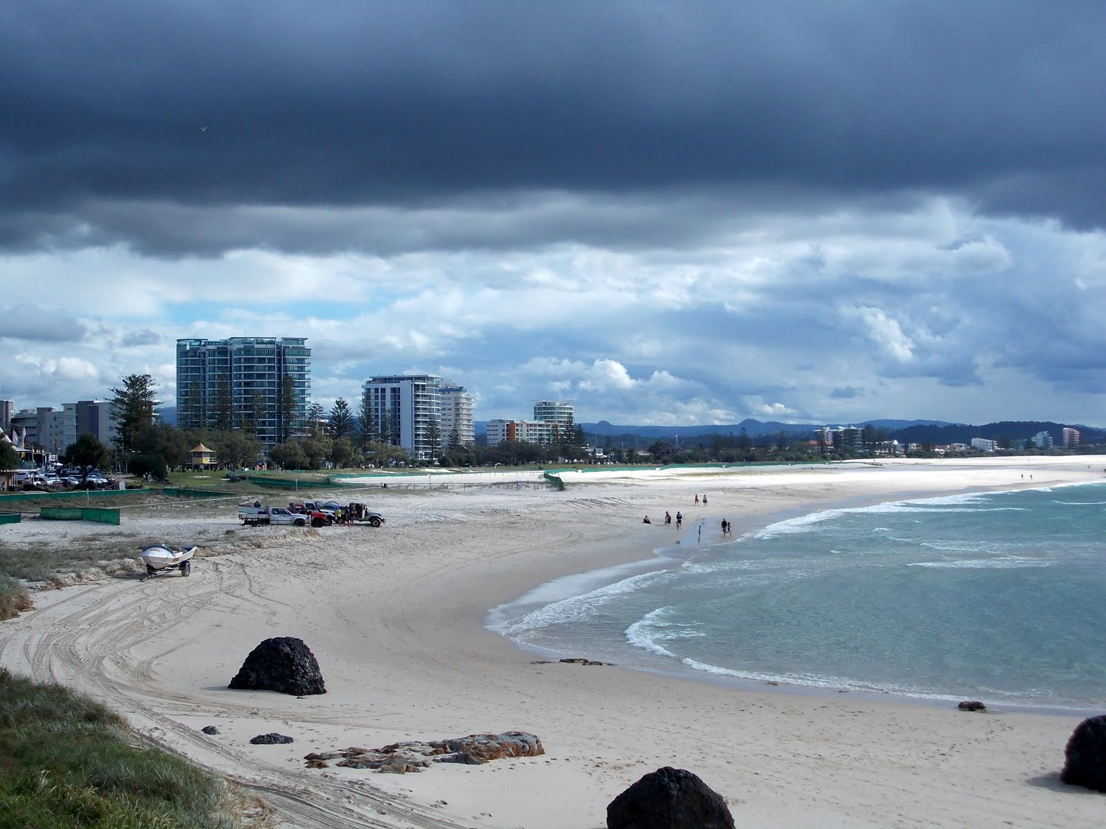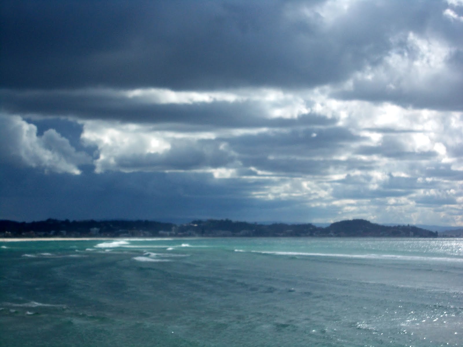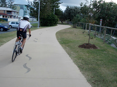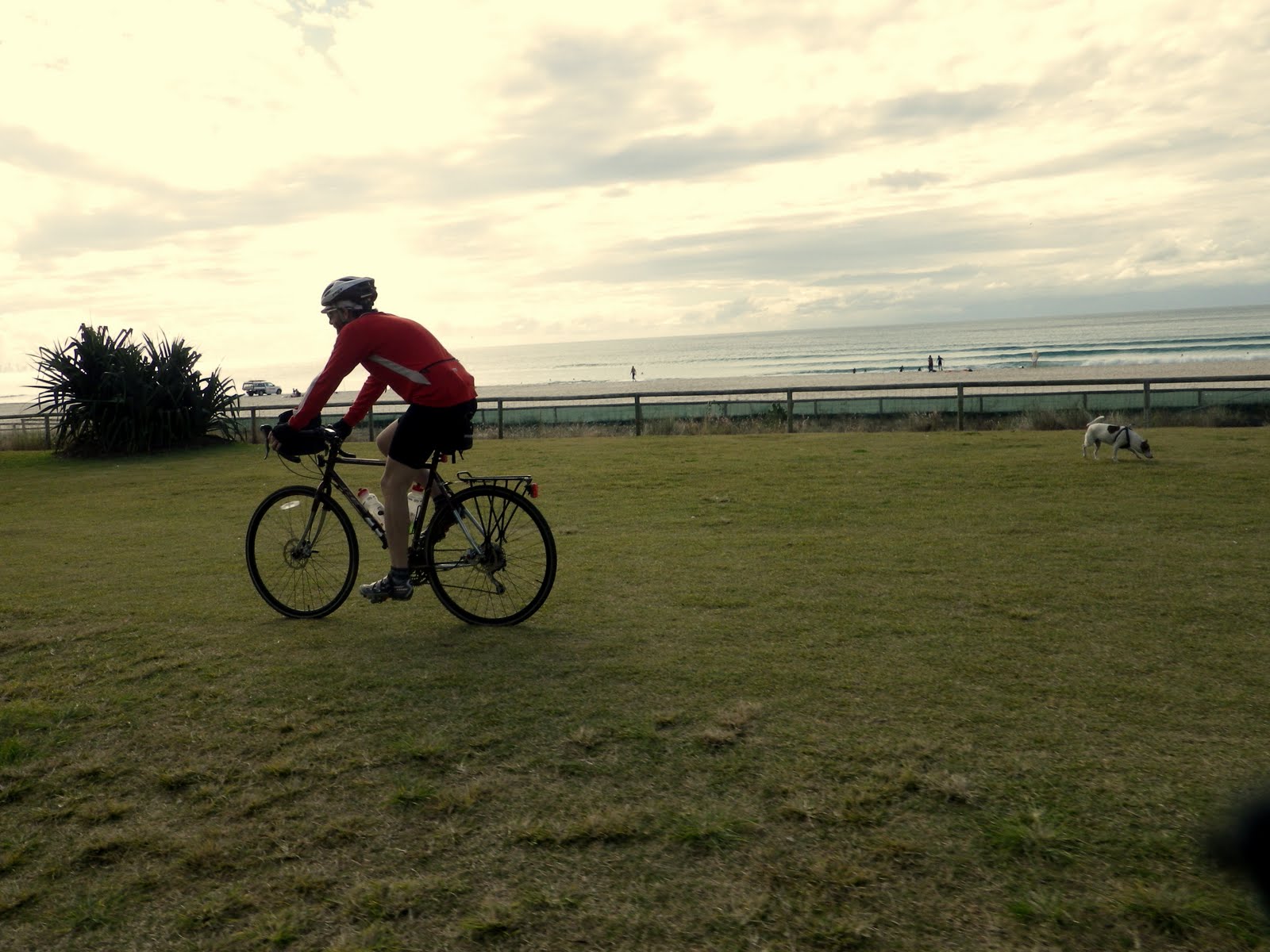 Once across the bridge we rode a little way into Coolangatta, back into Queensland. Our welcome back into the cycling state was entirely predictable, and literally within seconds we felt the warm glow of being back home when a passing bogan yelled out "FUCKHEADS!" as we pedalled into the commercial centre of town. After a short and confusing ride through the chaotic traffic scrum of the main street, we arrived at the beachfront of the Gold Coast. Dark clouds were really looming now and the wind was picking up noticeably - a storm was not far away. So with a strong tailwind to high tail it up seaside bike path along the coast to where the car was parked at Currumbin.