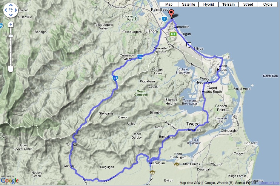 Up early on Sunday morning, loaded up my car, picked up Jer and his bike, and we were on our way. After just over an hour on the motorway we had reached the starting point of the day's ride - Currumbin on the Gold Coast. We parked down near the local surfing spot and proceeded to get ready to ride.