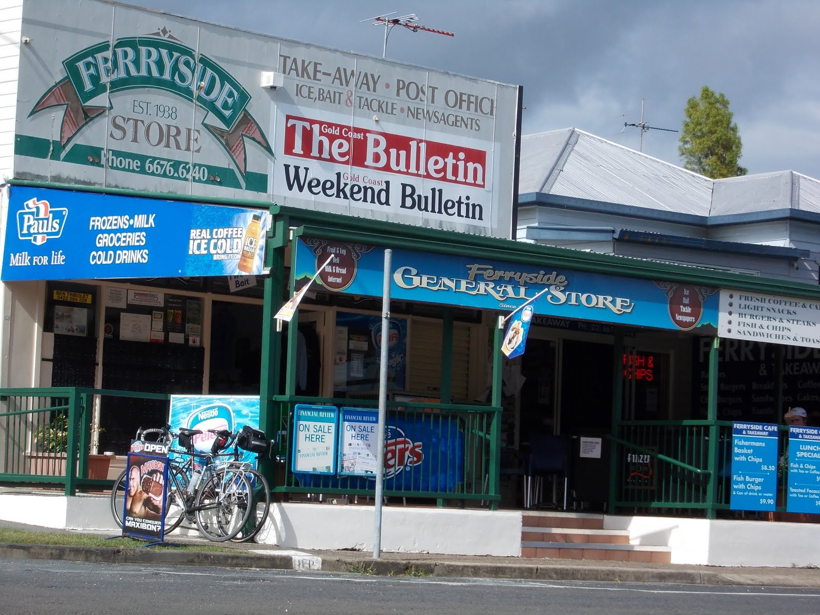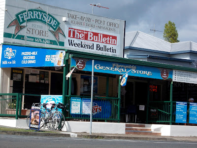 After a little while belting along through the cane, we found ourselves on a small road winding along the Tweed River. Across the river, we could see a little town, with a few small shops. We crossed over the river, and rode into the charming town of Tumbulgum to grab a coffee and a feed.