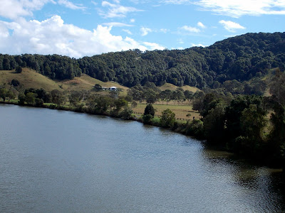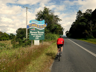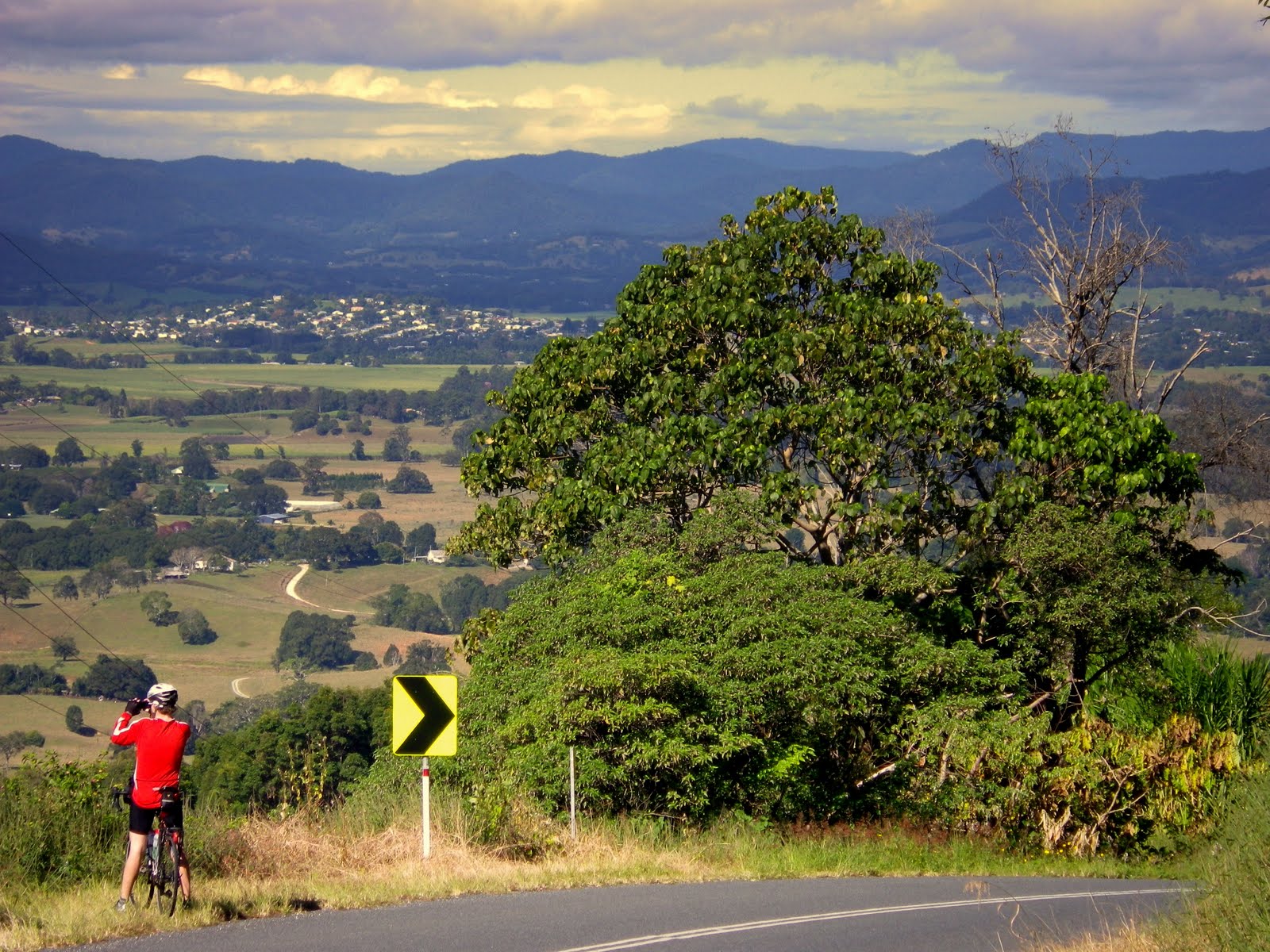 As soon as we passed into NSW at the summit of Mt Tomewin, two things happened. The state of the road improved noticeably, and the road dropped sharply into the Tweed Valley. The 5km descent down into the town of Dungay took only 6 minutes including a photo stop. It's a fairly winding road with steep drops off the edge and little margin for error, a fact I'm sure Jer appreciated on his Fuji. I was stopped by the side of the road taking a photo when I heard a hissing sound from uphill, along with a cloud of expletives - I turned around and Jer was steaming down the hill, both brakes jammed on all the way to the 'bars, with only mild deceleration happening. Terrifying for him, amusing for me.