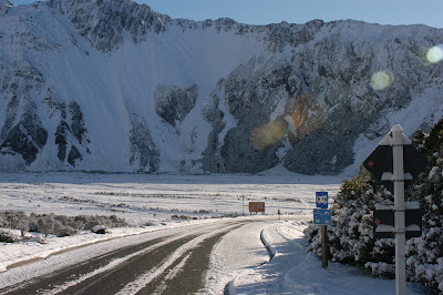 Outside was a proper winter wonderland, with crisp shining snow glistening in the bright sunlight. We quickly scoffed our breakfast and hurried outside to crunch around. Upon seeing the shining sun I felt a pang of regret that I wasn't riding the bike out of Mt Cook, but the second I stepped on the icy road and nearly slipped over, I felt validated in our decision to catch the bus.