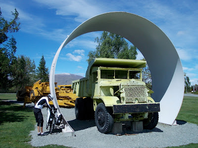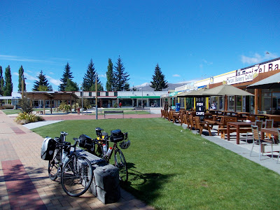 As Allan drove into the small town of Twizel, it was clear it wasn't just us who thought he was a cool guy. Pretty much every single car we saw had someone beeping and waving to him, and even people on the side of the road waved at him as we drove past - it was like he was the king of Twizel, or at very least the Lord Mayor. We unloaded our bikes, and headed into the very pleasant town square for breakfast, even though it was nearly midday. Twizel is apparently a very young town, established in the 1960s while the hydroelectricity scheme was being constructed. The town was due to be dismantled, but the townsfolk who lived there liked it so much, they lobbied for it to become a permanent settlement (Allan told us all this - I hope he reads this and is impressed with our recall!). I can see why they enjoyed it so much - on this day the sky was a brilliant blue, the sun was warm, snow covered mountains in the distance, and there was a surprisingly wide range of shops and cafes. Another nice touch was the council piping music into the town square, at a volume that drowned out the music in the cafe we were sitting at. Normally I'd find that kind of racket offensive, but when the authorities are blasting you with Get Out Of My Dreams Get Into My Car by Billy Ocean, it's pretty hard to be too upset about it.