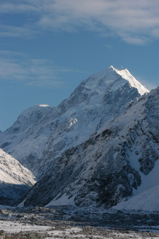 The icy peak of Mt Cook / Aoraki catching the morning sun