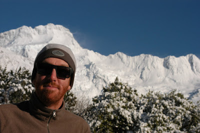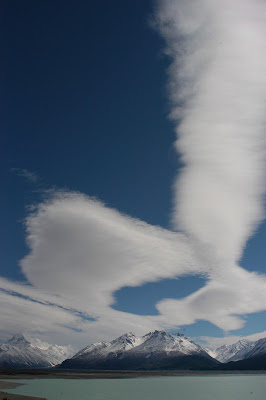 The Mt Cook Connections bus arrived at 10am. We were the only passengers, and our friend Allan from a few days earlier was driving us down to Twizel. Allan was a cool guy, and was fast becoming the hero of our trip. He had saved me from the crazy winds at Lake Pukaki, allowed Jer to recover by driving him up from Lake Tekapo, and all along the way was the consumate professional and guide, equipping us with all sorts of knowledge about the region. Now he took his heroic status to the next level - producing Jer's missing sunglasses out of the glove compartment. Jer was beside himself with gratitude, and we headed off towards Twizel. As soon as we turned out of the valley and onto the shores of Lake Pukaki, the snow disappeared, and we were back in a dry, brown landscape. We drove along chatting to Allan, trying to impress him with how much independent learning we'd done about Mt Cook.