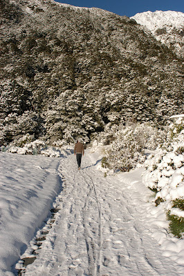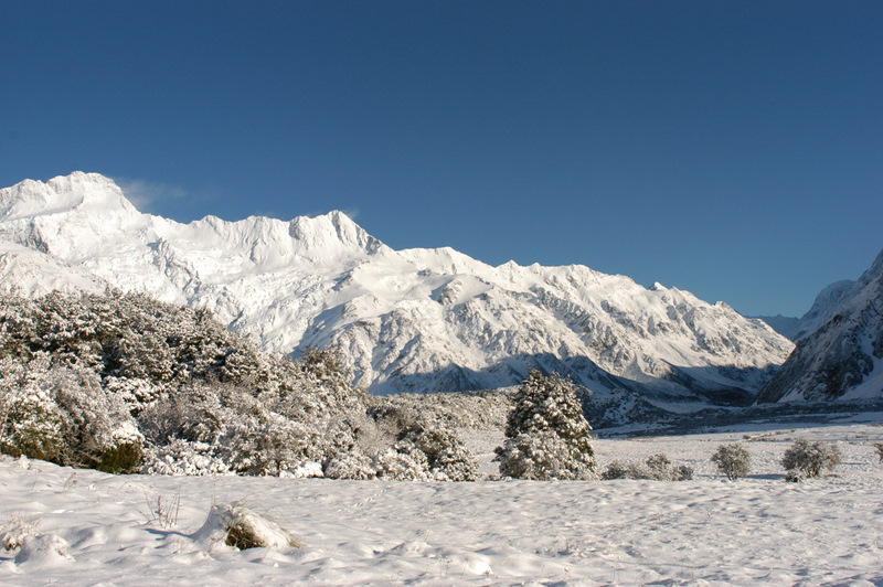 Looking back up into the snowy valley to Mt Cook village, to the left of the photo