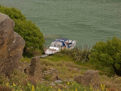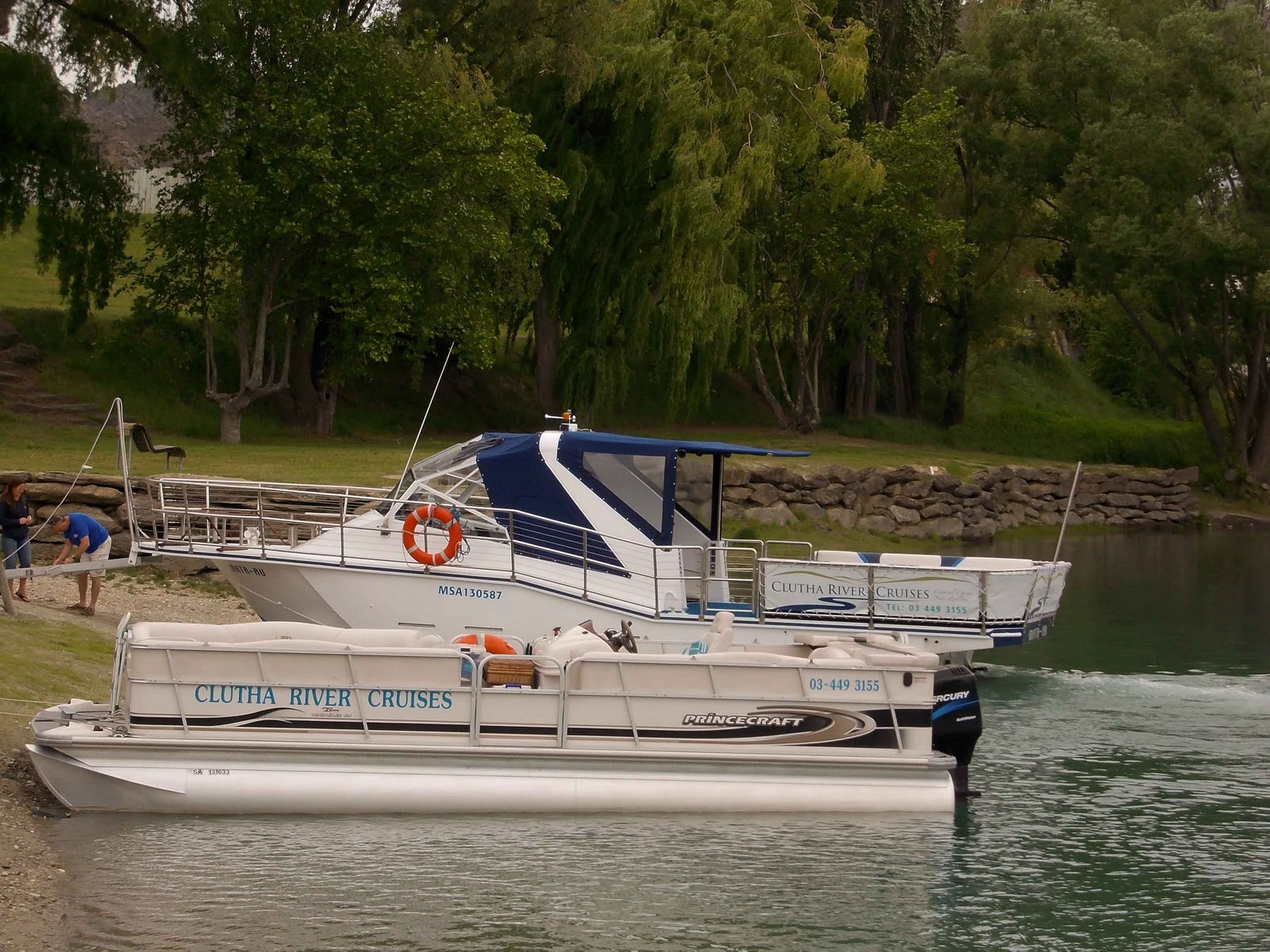 We returned to the mooring to find both vessels ready to go. The larger vessel, the Mata-Au is particularly impressive, and originally began life as a harbour pilot boat. It has since been fitted out to be more of a luxury power cruiser, with a wide beam and huge engines from its days as a commercial vessel. Jer and I crawled all over it doing what we always do when we are in a nautical situation - trying to squeeze in as many boat-specific terms as possible in a vain attempt to bamboozle each other. The time soon came to get moving, and we transferred onto the other vessel, a large pontoon craft called the Nevache II. It was only Sam, Jer and myself on the pontoon vessel, and we were lucky to be on our own private excursion into the mining heritage of the Clutha River.