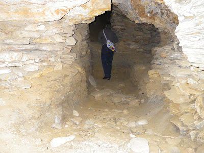 Jer stands at the entrance of another underground tunnel network, under a jumbled pile of schist rock