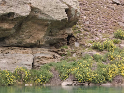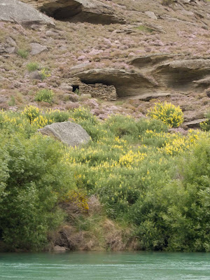 As we rounded the first bend of the river and lost sight of town, we were transported into another world. We plunged into an immensely steep and tall gorge, with the cold wind and light drizzle biting our faces as we cruised up the river. The river itself was a peculiar shade of greenish blue, and was a powerfully fast flowing body of water. The temperature was around 10 degrees celcius and the sky an ominous grey, with the gloomy conditions enhancing the stories of hardship from the mining days. The gorge was bathed in an odd grey light and lacked contrast, making the whole place seem even more bleak and desolate - and from all accounts the Central Otago minefields weren't a very happy place for those trying to eke a living from the rugged landscape. Sam was telling us all about the thousands of miners who lived and worked along this stretch of river in the 1800s, when she suddenly pointed to the side of the gorge and said "do you see the miner's hut over there...?"