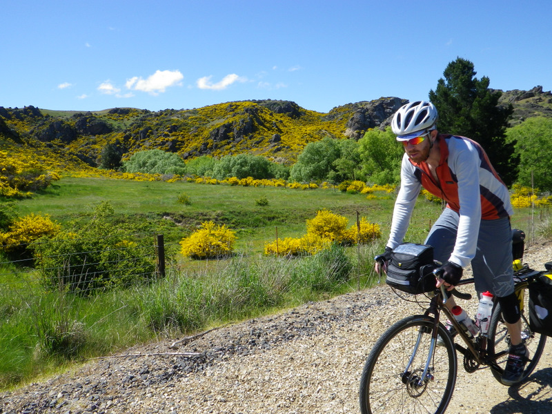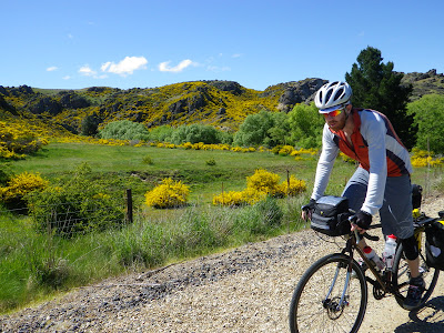 Yellow flowers covered the outcrops of schist rock - the joys of spring cycling in Otago