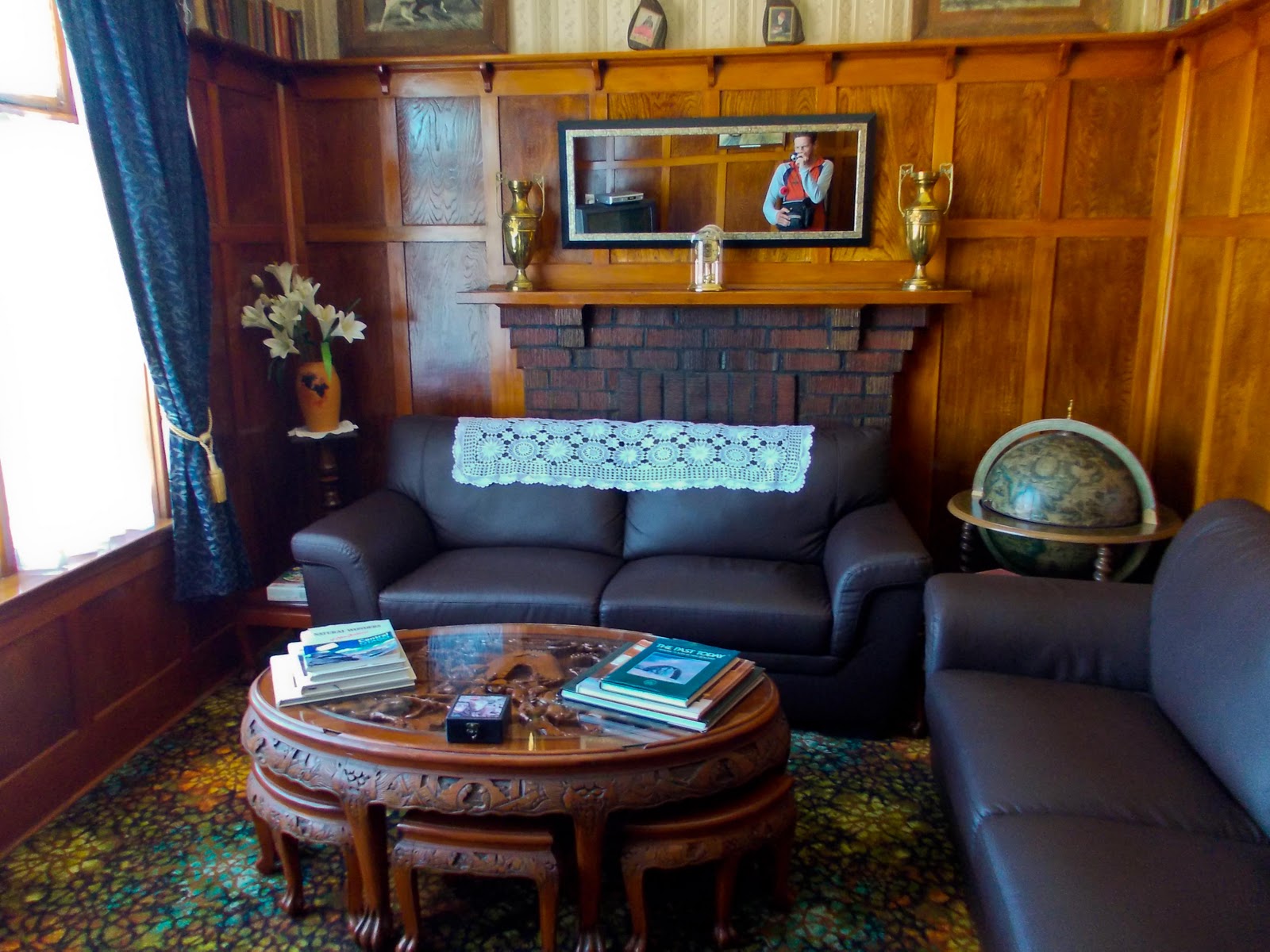 The library and sitting room at the Omakau Commercial Hotel - I felt like some sort of James Bond super villain lounging around in here. Note the ghostly figure in the mirror