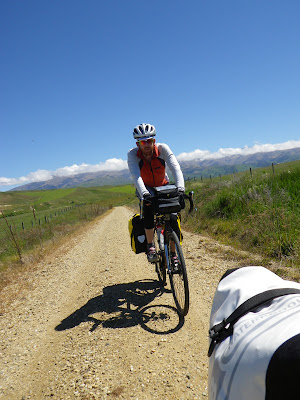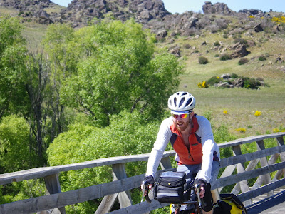 I have no idea why I was standing up, probably trying to look tough for the camera. The Otago Central Rail Trail has no steep inclines - the ye olde steam trains couldn't handle anything more than a 1:50 gradient, and now we were reaping the benefits