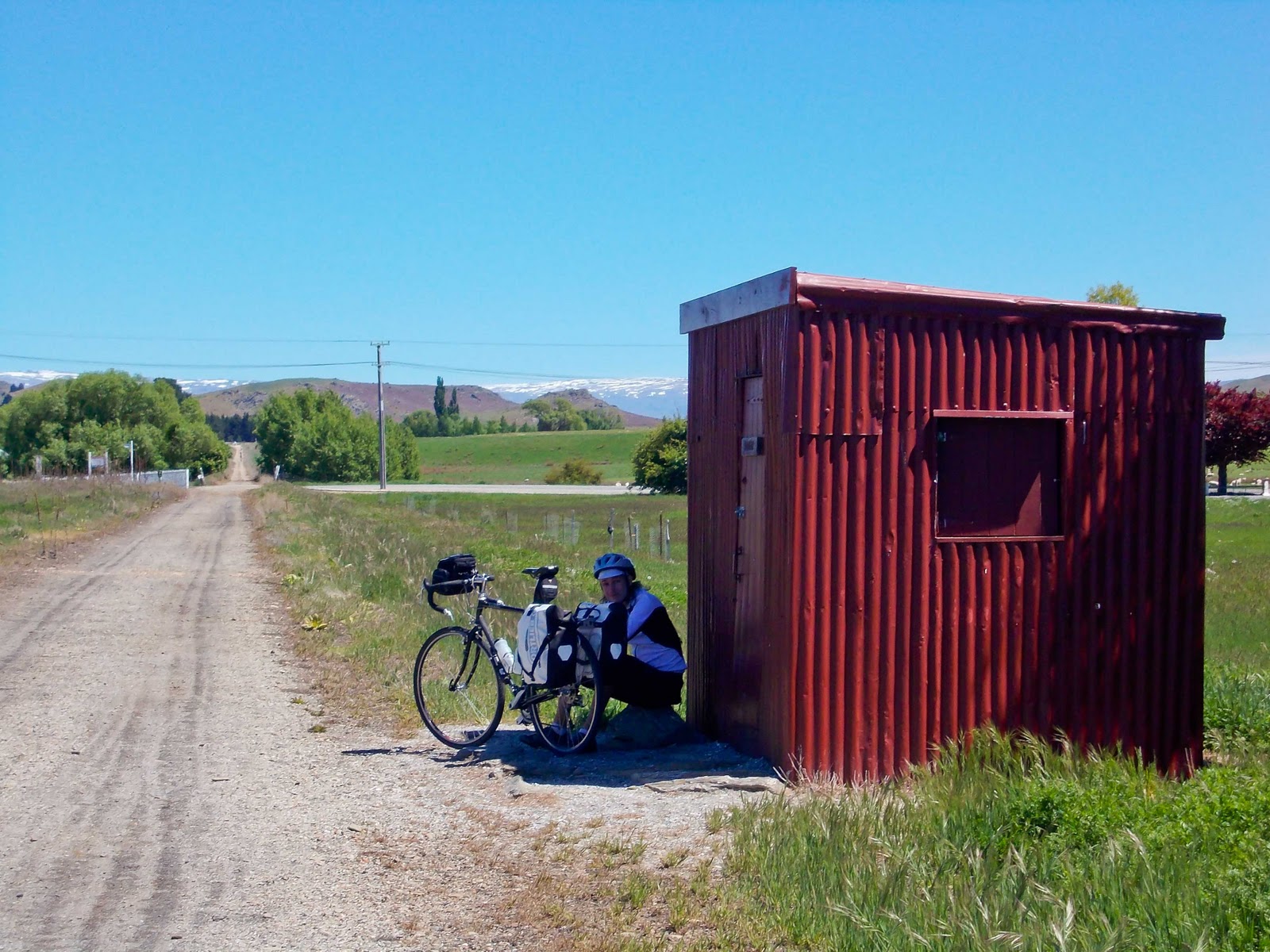 Jer shelters next to the Omakau ganger's shed, while I do my usual routine of reading all the signs, exploring all the buildings and generally mucking around for ages