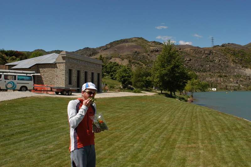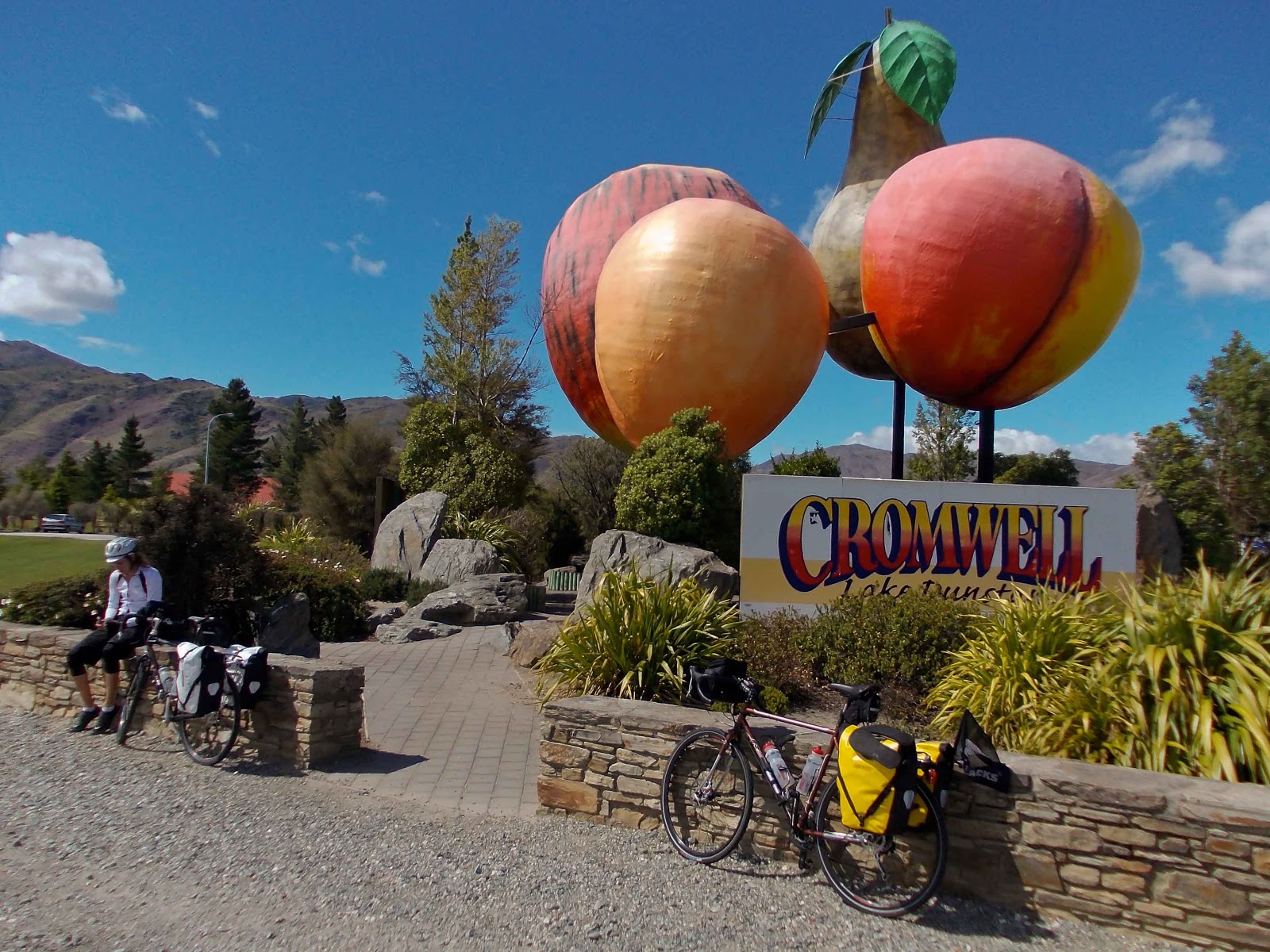 As we rode along the lake, we could see the town of Cromwell on the southern shore. With the easy riding of the morning, we had arrived a few hours ahead of schedule. We were due to meet up for lunch with my friend Ross, who was keen to share his knowledge of the area with us. Ross had mentioned to me a couple of times about a distinctive fruit monument on the edge of town, heralding our arrival into town. It certainly was distinctive, I spotted it from at least 4km away across the vineyards at the edge of Cromwell. After stopping for the obligatory photos, we met up with Ross at the nearby Golden Gate Lodge, and swapped two wheel for four as Ross very kindly took us on our own personalised tour of the region around Cromwell.